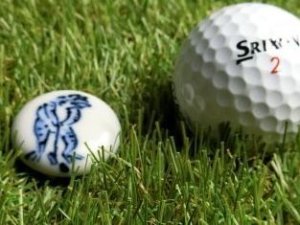 グリーンの上で和柄の美しい清水焼ゴルフマーカーを、